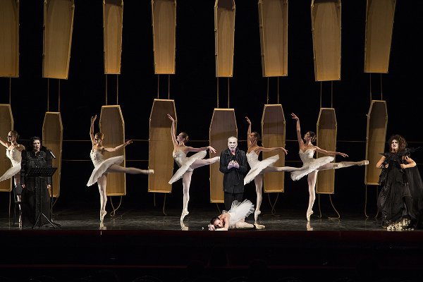 Потом гробы уехали наверх, и вместо них опустились канаты с привязанными ножами. Один из мужчин в черном волочил связанную балерину за ногу через всю сцену.